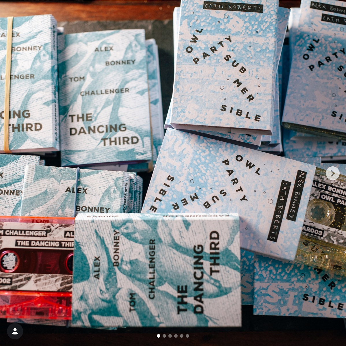 Digital album cover for Owl Party Submersible by Alex Bonney and Cath Roberts, 2026, plus two tape covers and onbody labels I designed as part of ongoing graphic design for the Earconnector label.